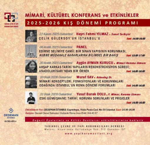 Tarihsel Çevre ve Yapı Korumacıları Derneği olarak 2025-2026 Kış Dönemi Mimari ve Kültürel Konferans Programımızı duyurmaktan mutluluk duyuyoruz.Bu dönem, mimarlık, koruma etiği ve kültürel miras alanlarında farklı uzmanlıkları bir araya getiren konferans ve panel buluşmalarımız Dedeman İstanbul ev sahipiliğinde gerçekleşecektir.Değerli üyelerimizi ve tüm kültür dostlarını etkinlerimize davet ediyoruz.